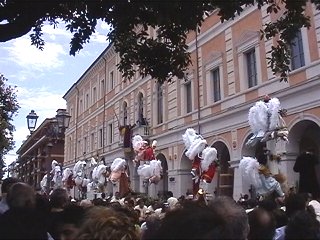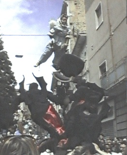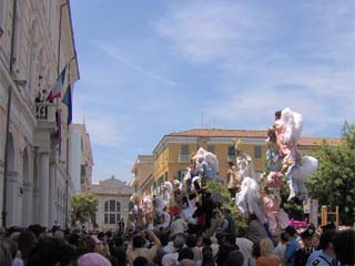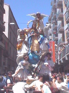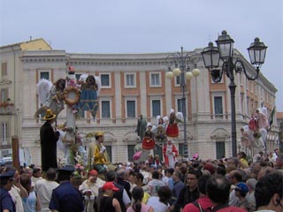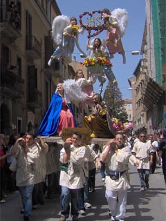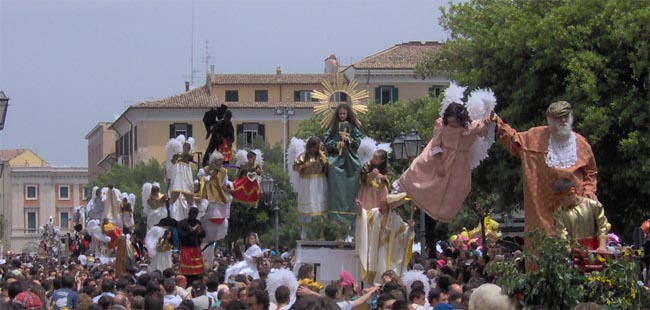 I Misteri sfilano per le vie di Campobasso il giorno del Corpus Domini, tutti gli anni ed in qualche occasione particolare. Si tratta di raffigurazioni a sfondo sacro, relative a descrizioni del Vecchio e Nuovo Testamento, della vita dei Santi, dei dogmi. Sulle piattaforme di legno si compongono questi "quadri viventi" con figure simboliche di santi, diavoli e angeli, sostenuti da una struttura metallica, ben integrata nella raffigurazione. Angeli, demoni, Madonne e Santi benedicenti, impersonificati da figuranti e bambini, sfiorano il cielo su macchine condotte in spalla da decine di portatori che, al passo e sulle note del "Mosè" di Rossini, imprimono alle figure un caratteristico ed unico movimento ritmato. L'ideazione delle così dette "Macchine o Ingegni" è dovuta allo scultore ed artista campobassano Paolo Saverio Di Zinno che le ideò nel 1700. La tradizione locale vuole che la struttura portante sia stata fusa dallo stesso Di Zinno che ha mantenuto segreta la costituzione della "speciale lega". In diverse chiese del Molise, figurano opere lignee dell'insigne scultore. Il numero e l'ordine delle rappresentazioni è mutato più volte nel tempo. Attualmente i Misteri sono 13. La prima macchina è un'allegoria di Sant'Isidoro. Seguono le altre allegorie: San Crispino, San Gennaro, Abramo - l'angelo, sospeso in cielo, trattiene la mano di Abramo nel gesto di voler sacrificare il figlioletto Isacco, reclino sulla pira.-, La Maddalena, Sant'Antonio Abate con il diavolo che "tenta" dalla donzella, l'Immacolata Concezione, San Leonardo, San Rocco, L'Assunta, San Michele che spofonda nell'inferno tre diavoli sbeffeggianti, San Nicola e il Sacro Cuore. Le "macchine" sfilano tutti gli anni, una interruzione si ebbe durante il periodo bellico e fino al 1947. Dopo la vestizione, i Misteri escono all'aperto e seguono uno specifico percorso. Si dirigono verso il borgo antico con tutta la suggestione dei luoghi. I bambini "angioletti e diavoletti" posti in alto allungano le braccia per ricevere dolciumi dalle persone affacciate sui balconi. Qui vi è il momento solenne per gli onori al Di Zinno, passando davanti alla sua casa natale. Usciti dal centro storico, gli "ingegni" percorrono le vie cittadine della città più moderna. Durante tutto il percorso si fanno numerose soste, per dar riposo ai portatori a spalla che ne sopportano il peso delle macchine. Con l'occasione i visitatori, numerosissimi, si accalcano vicino alle "macchine" per fare foto ricordo e qualcuno per farsi lasciare il "segno del diavolo", con la tintura del viso, dalle mani dei demoni, bambini "impauriti e piangenti" compresi. La sfilata raggiunge il centro "murattiano", nella Campobasso di inizio ottocento. A conclusione, i Misteri vengono allineati davanti al municipio per ricevere la benedizione. Al suono della marcia musicale che le accompagna lungo tutto il precorso, le macchine vengono riportate nei luoghi di allestimento, per essere impoverite dei personaggi e conservate in attesa di sfilare nuovamente, l'anno successivo. Le macchine, anche se private dei personaggi "viventi", vengono ricomposte in un'area museale per essere ammirate tutto l'anno. |