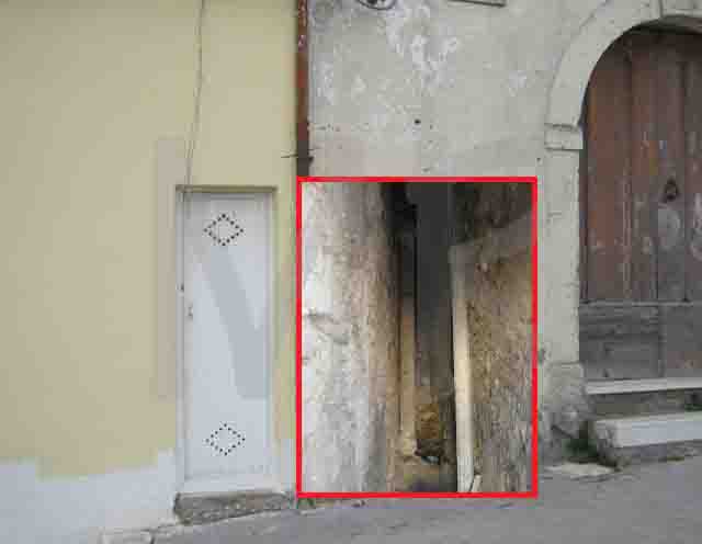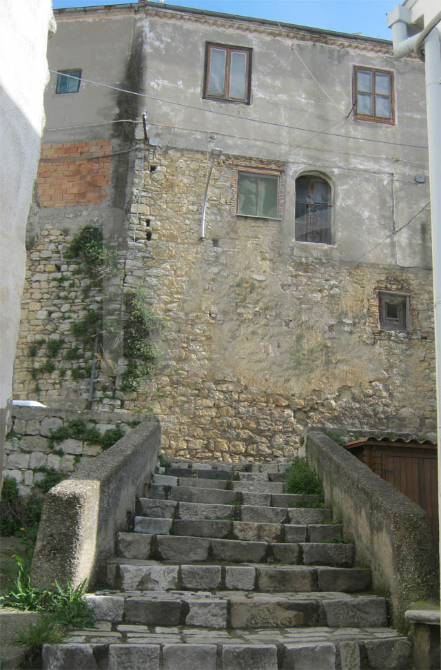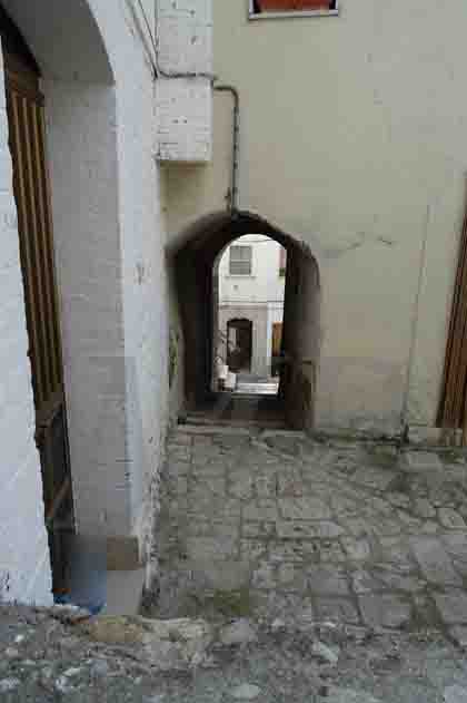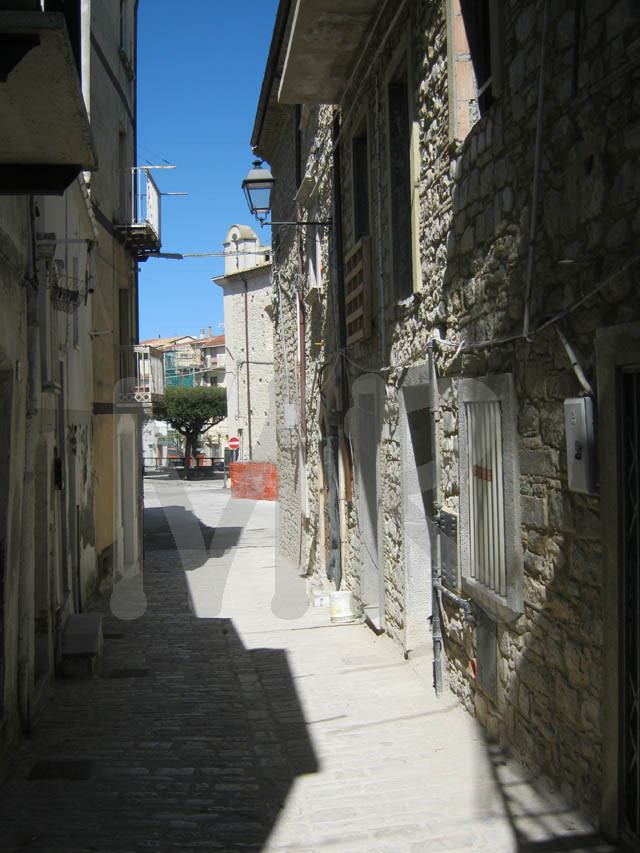 Ad occidente, verso la chiesa del Purgatorio, in tempi relativamente più recenti (prima metà del 1700), come voluto da Mons. Andrea Tria, vescovo di Larino, e descritto nelle sue Memorie Storiche, venne ampliata la Chiesa Matrice e dato decoro all’area circostante. Della chiesa antica penso che sia rimasto il portale laterale, ben lavorato, con bassorilievi tra cui la testa di San Giovanni Battista e il passaggio alla Sagrestia con il relativo sottoportico. Non sono riuscito a capire la funzione iniziale, di questo sottoportico, che si presenta come una vera e propria porta di accesso all’inverso!