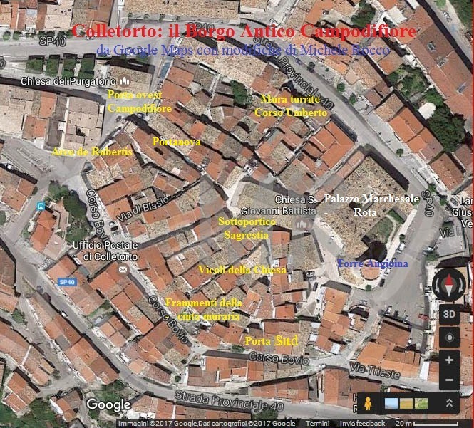 Il primo insediamento si suppone abbia avuto origine nel XIII secolo, intorno a una fortificazione-castello preesistente alla edificazione della Torre Angioina (che risale ai tempi della Regina Giovanna d’Angiò – XIV secolo). Il Borgo Antico è, per tutti i colletortesi, identificabile con Campodifiore “camp d scio’r”. Il borgo di struttura medievale, era, ed è ancora racchiuso da mura, visibili solo a tratti per via della soprapposizione o della sostituzione di altre costruzioni nel tempo. Le mura sul lato sud (corso Bovio), in posizione più scoscesa, presentano dei contrafforti a struttura obliqua, quelle sul lato nord (corso Umberto) sono turrite con contrafforti (una torretta è ancora visibile). Per accedere al borgo vi erano le porte, due ancora esistenti: la porta a sud, su corso Bovio e quella ad ovest, occidentale, rappresentata dall’arco o sottoportico (s’ppor’t) di Campodifiore. Forse vi era una porta ad est(???), attuale passaggio tra largo Verdi (chiesa), e largo Angioino (“n’gopp a cro’c”). E' probabile che questa porta orientale, già rudere, sia stata delolita definitivamente con la costruzione del Palazzo Marchesale (prima metà del 1700), per dare un ulteriore accesso al giardino del Marchese Rota. Ed è possibile che esistesse anche una porta a nord, ma le modifiche radicali su quel lato (palazzo e costruzioni private) non ne hanno lasciato traccia. Un piccolo scorcio su corso Umberto, come dicevo, conserva ancora resti delle mura turrite.