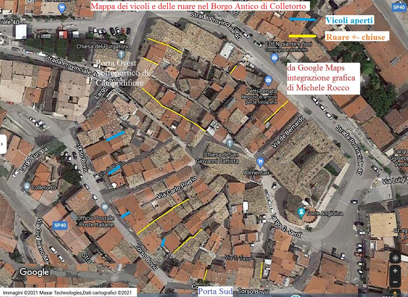 Sono quattro i vicoli transitabili a piedi che hanno sbocco all’esterno del borgo antico. Sono diretti tutti verso il lato sud di quella che, un tempo, doveva essere la cinta muraria sull’attuale corso Bovio. In relazione al percorso scelto, se in entrata nel borgo o in uscita da esso, possiamo dare un ordine di comparsa per avere una visione univoca. | |||||||||||||||||