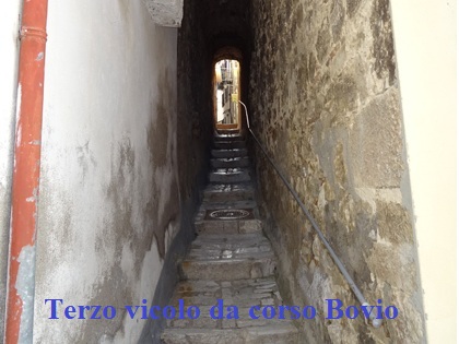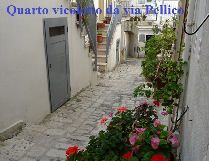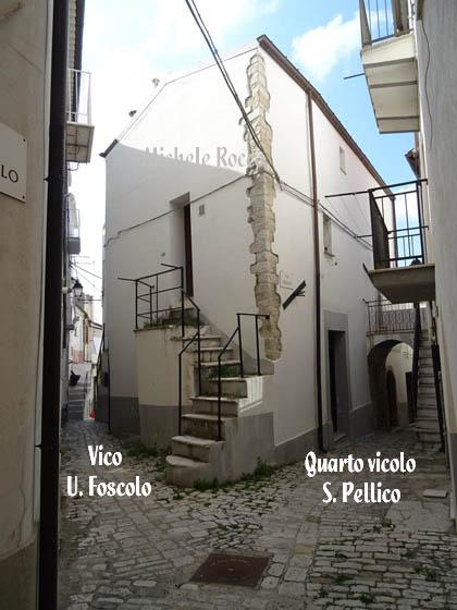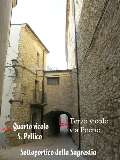 Proseguendo ulteriormente per corso Bovio, troviamo un gruppo di abitazioni in una soprelevata rientrante. A sinistra dello spiazzo, salendo alcuni gradini, troviamo il quarto vicoletto a strettoia anch’essa piuttosto angusta e con gradini che porta al vico Silvio Pellico. Questo vicolo, dall'interno del borgo, si biforca dal vico Ugo Foscolo, subito dopo l’ingresso del sottoportico della sagrestia e quasi all’uscita della porta secondaria della chiesa. | |||||||||||||||||