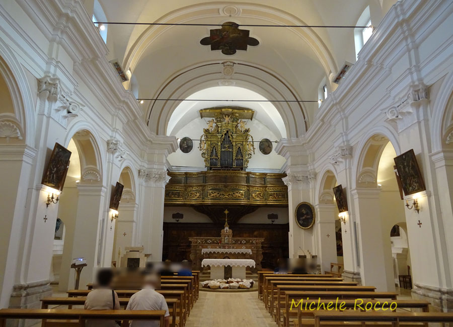 Entrando nella chiesa si rimane affascinati dalla visione complessiva del suo interno. Colpisce immediatamente, sullo sfondo, nell’abside, in alto, il magnifico organo intagliato, opera realizzata nel 1762 da Francesco D’Onofrio, fine organaro di Caccavone, l’attuale Poggio Sannita. Si notano immediatamente i quattro archi bilaterali, ornati di stucchi, che delimitano altrettante cappelle, poste nelle navate laterali. |