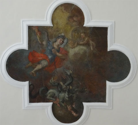 Sulla volta sono presenti due affreschi rappresentati l’Assunzione, e San Michele, opere dell’artista napoletano Placido Flaxis. Lo stesso autore ha affrescato le lunette dei santi presenti nella chiesa e indorato gli stucchi. Potrebbe essere lui anche l’autore dei quadri della Via Crucis (attribuiti al Gamba).
