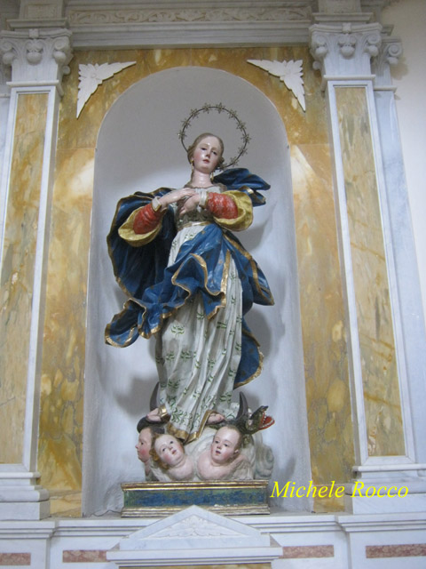 Nelle cappelle troviamo le statue dei santi, alcune di notevole fattura. Alla ricostruzione, a metà del 1700, la chiesa continua ad avere la sua originale intitolazione a Santa Maria del Carmine. Al suo interno è ammirabile, nell’ultimo altare della navata sinistra, una magnifica statua della Madonna del Carmine, realizzata dall’insigne artista campobassano Paolo Saverio di Zinno (sezione tematica), proprio quello dei famosi Misteri che sfilano a Campobasso nel Corpus Domini. Nel penultimo altare di sinistra è ammirabile un’altra opera eccelsa dello stesso di Zinno, l’Immacolata Concezione. | ||