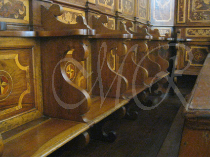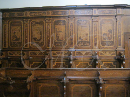 Le tarsie sono intervallate da colonnine anch'esse intarsiate e nello schienale dello stallo vi sono fregi e.... |
