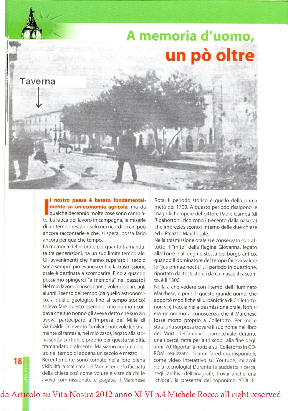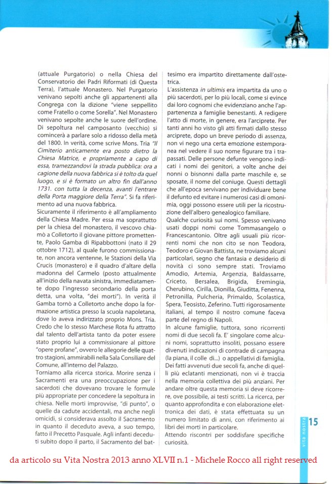 Nell'articolo sono presenti alcune imprecisioni. La scala monumentale che porta al monastero è opera di fine 1800. La morte del Marchese Bartolomeo Rota è solo riportata sul frontespizio di uno dei Libri dei Morti, non è avvenuta a Colletorto (come diversamente scritto anche nel CD-ROM) e dubbia è la lettura dell'anno di morte. Si tratta di una parte delle ricerche che poi, 2020, ho riportato sul mio libro. | ||