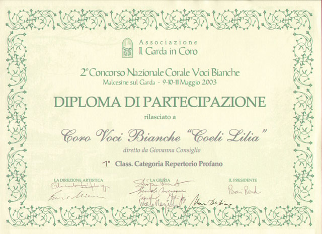 Il coro di Voci Bianche "COELI LILIA" dell'Istituto Comprensivo "G.A. COLOZZA" di Campobasso ha partecipato al 2° Concorso Nazionale Corale Voci Bianche di Malcesine sul Garda in provincia di Verona nei giorni 9-10-11 Maggio. Il Coro diretto dalla Prof.ssa Giovanna Consiglio si è aggiudicato il 1° Premio assoluto nella categoria Profano, Premio Speciale FE.N.I.A.R.C.O. per la migliore esecuzione di un brano tratto dalla raccolta "Giro Giro Canto" edito dalla Feniarco – Pizzicot. Premio Speciale come miglior Direttore. Il Coro della "Colozza" costituitosi nel 1998, ha al suo attivo una intensa attività concertistica ed ha riportato il 3° Premio al 37° Concorso Nazionale Corale "Trofei città di Vittorio Veneto" il 27 maggio 2002. I 32 coristi della Scuola Media, di età compresa tra gli 11 e i 14 anni, hanno preparato con tenacia per sette mesi il repertorio polifonico eseguito in Concorso che abbraccia autori dal periodo Barocco a quello Contemporaneo molisano: Purcell, Tabasso, Caraba, Spadaccino, Morellini, Buccolo e nel corso della cerimonia di premiazione il Presidente della Feniarco M° Sante Fenasier si è complimentato perché finalmente anche dal Molise è possibile ascoltare una realtà corale di Voci Bianche finora del tutto assente dal panorama nazionale. Al Concorso hanno partecipato 18 cori, 3 per la Categoria Sacro e 15 per la Categoria Profano, provenienti soprattutto dal settentrione e la Commissione Giudicatrice, costituita da personalità di rilievo nel mondo della coralità italiana, si è espressa tenendo conto della qualità tecnica di interpretazione dei cori partecipanti |