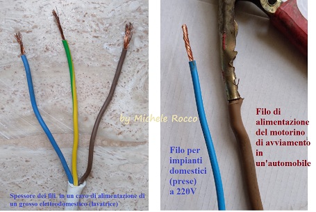 Pensiamo ora al motorino di avviamento di un' automobile (supponendolo della stessa potenza di quello di una lavatrice) 500W. Orbene questo motorino viene messo in movimento con una tensione di 12 V (quella della batteria). Essendo di gran lunga minore la spinta degli elettroni (rispetto alla tensione 220V), come fare arrivare la stessa quantità di elettroni, necessaria, al motorino? Ebbene occorre che il filo sia percorso da una quantità molto maggiore di elettroni (corrente) Quindi occorre un filo molto più spesso. Qui le correnti in gioco sono di alcune decine di ampère (40A).