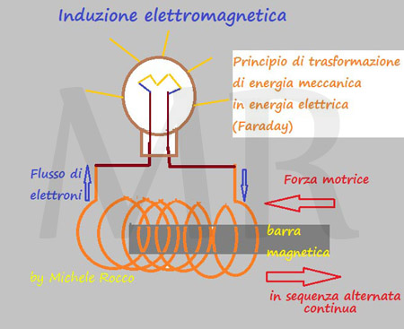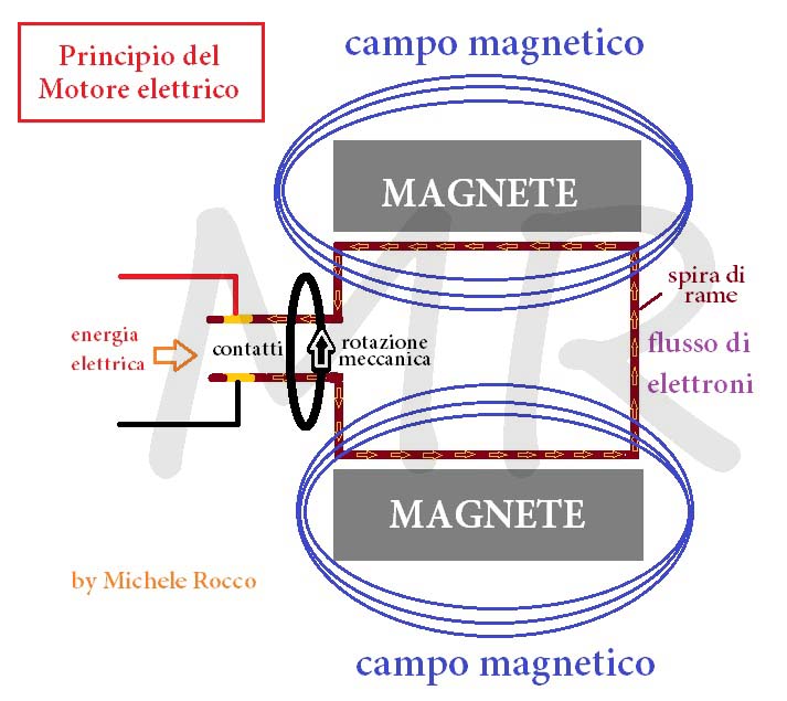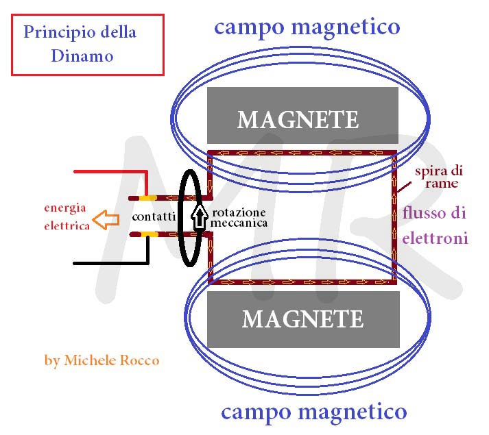 Nel caso del Motore elettrico, l'energia elettrica viene trasformata in energia meccanica di movimento. L'energia (elettrica) che fluisce nella spira determina il movimento meccanico del supporto (rotore) su cui sono avvolte le spire di rame. Questo avviene perchè gli elettroni, che provengono da una fonte esterna, tramite i contatti, fluiscono nella spira, generano un campo magnetico (variabile), in opposizione a quello (fisso), già presente. Nel caso della Dinamo, dell'Alternatore o più in generale, generatore di corrente elettrica, energia meccanica viene trasformata in energia elettrica. Occorre una forza meccanica esterna che mette in movimento il supporto (rotore) su cui sono avvolte le spire. In questo caso il campo magnetico esistente (fisso), al variare della posizione della spira, induce gli elettroni a muoversi dentro di essa, generando un flusso di corrente, prelevabile ai contatti. In entrambi i casi, Motore elettrico o Dinamo, spesso nelle apparecchiature, anche i magneti fissi sono sostituiti da spire di rame che, percorse da corrente, sono esse a generare il campo magnetico fisso (per autoinduzione), senza necessità di usare magneti permanenti. Le varianti sono diverse, ma qui mi attengo solo al principio. L'elettricità è una forma nobile di energia, è impalpabile (ma si prende la scossa). La si trasferisce, semplicemente, con fili di rame e può essere convertita in tutte le altre forme di energia (meccanica, luminosa, termica) e se ne può prelevare la quantità che si vuole, nel luogo dove ci serve.