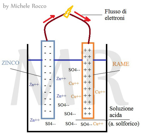 Lo zinco in una soluzione acida tende ad essere corroso dall'acido mandando in soluzione ioni Zinco Z++. Anche il rame viene corroso dall'acido mandando in soluzione ioni rame Cu++