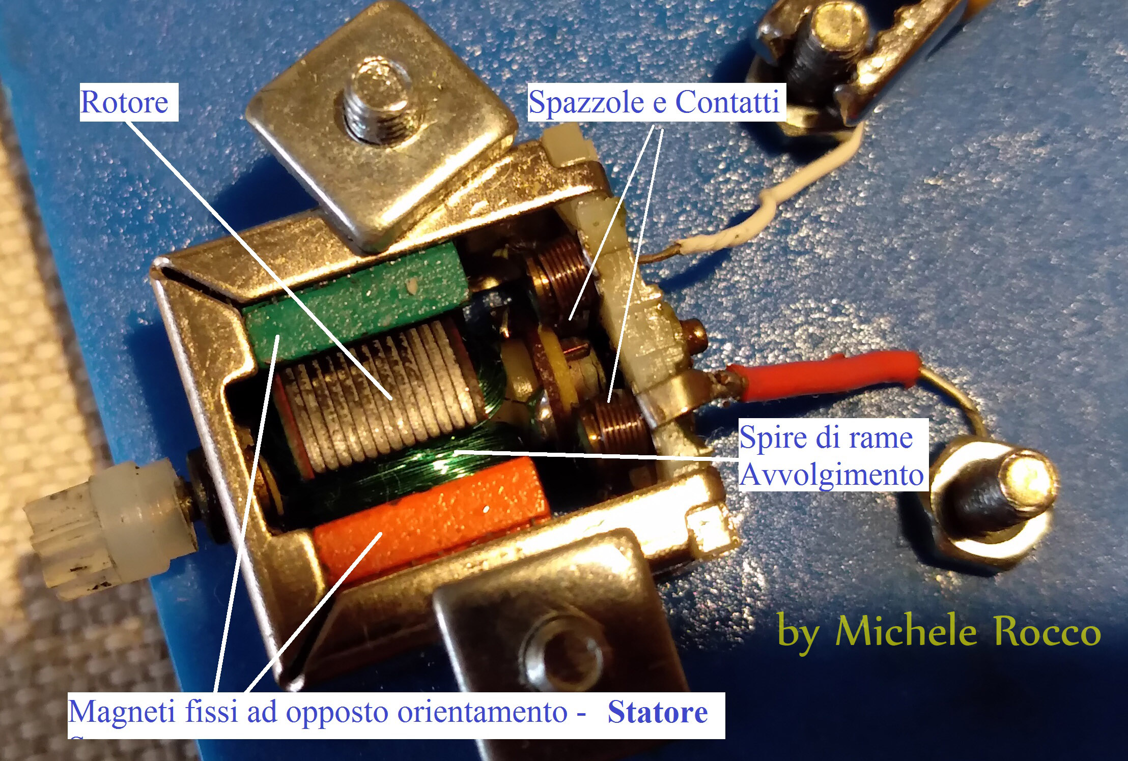 Motorino elettrico dimostrativo. Elementi basilari. Quando un filo (spira di rame del rotore) è percorso da corrente genera un campo magnetico. Questo magnetizza la componente metallica del rotore, che viene attratta (da un lato) e respinta (dall'altra) dai due magneti fissi (a diverso orientamento), provocando il movimento meccanico del rotore. La successiva inversione del verso della corrente (tramite le spazzole) e quindi del campo megnetico, opportunamente realizzato, mantiene il rotore in movimento, nello stesso verso. A questo punto, dall'asse del rotore, possiamo prelevare energia meccanica. Questo tipo di motorino, proprio per la presenda dei magneti fissi, è in grado di funzionare anche come generatore di corrente. Ovvero, se applichiamo al rotore una forza motrice, ai capi dei due fili uscenti, possiamo ottenere corrente elettrica. | |