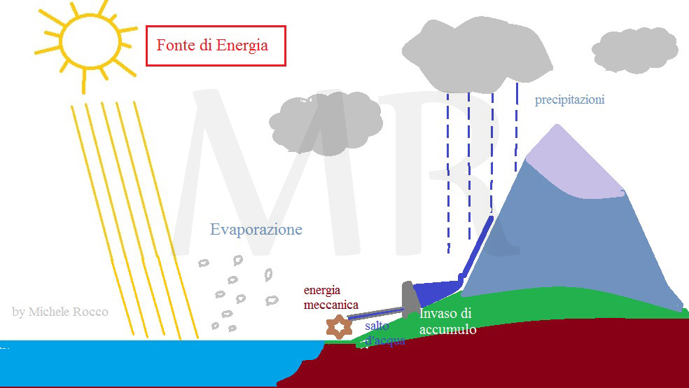 E, a proposito di monti, faccio un semplice esempio. L'acqua sulle cime delle montagne non ci arriva da sola, ci arriva dal cielo sotto forma di precipitazioni, anche nevose. Se andiamo ad osservare il processo che ha portato alle concentrazioni di vapor d'acqua nelle nuvole (da cui viene la pioggia), ci accorgiamo che questo vapore si è formato dall'evaporazione dell'acqua del mare (in particolare) ed è arrivato a quelle altezze tramite l'energia del Sole. Ecco, la fonte di energia è questa, il Sole. Nel momento in cui questa energia che proviene dal Sole arriva sulla Terra, abbiamo solo trasformazioni.