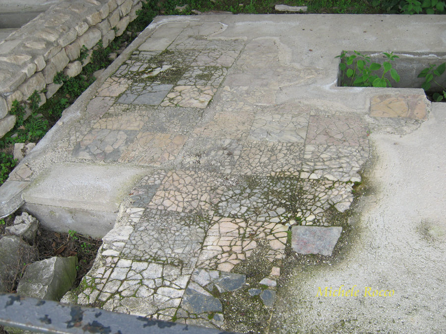 Tra il teatro e la porta Boiano, come è tipico nelle città romane, troviamo le Terme. Un residuo della pavimentazione, sostenuta da colonnine, evidenzia quale dovesse essere il sistema di riscaldamento dell'acqua e dell'ambiente termale. |