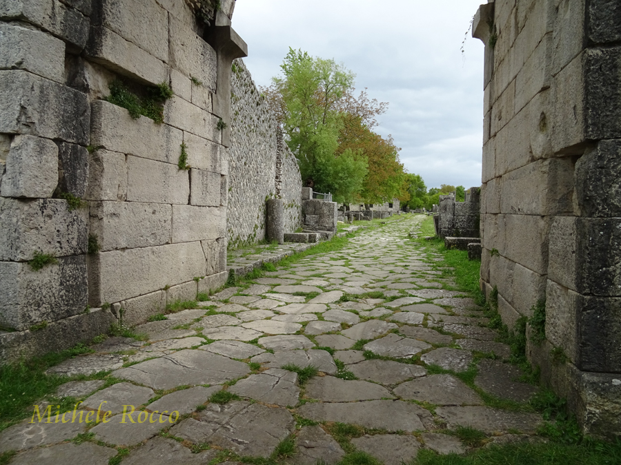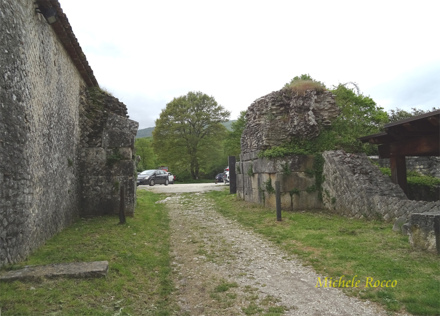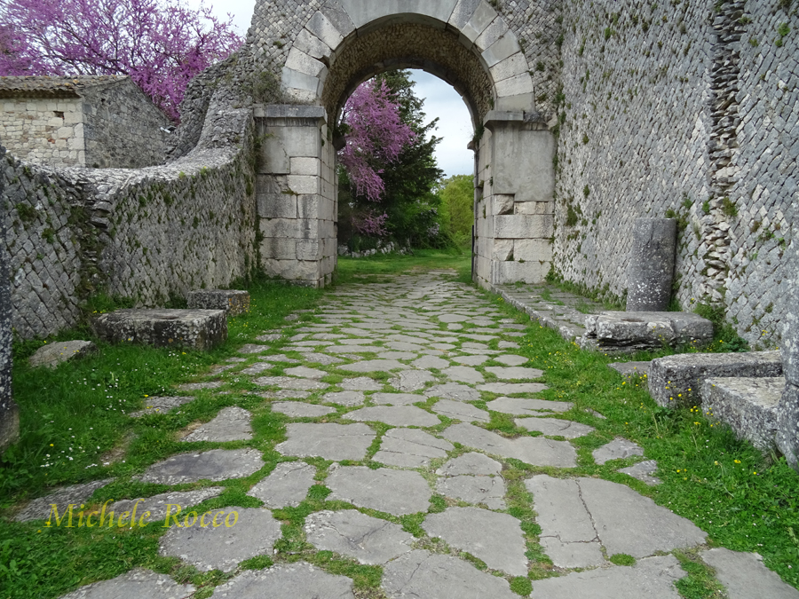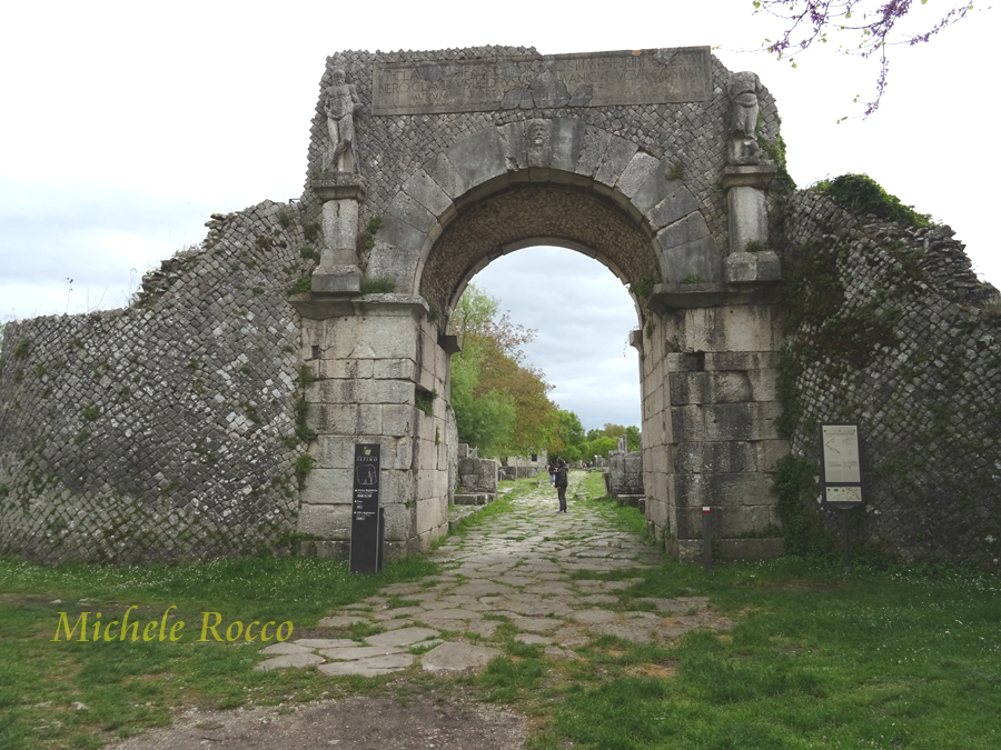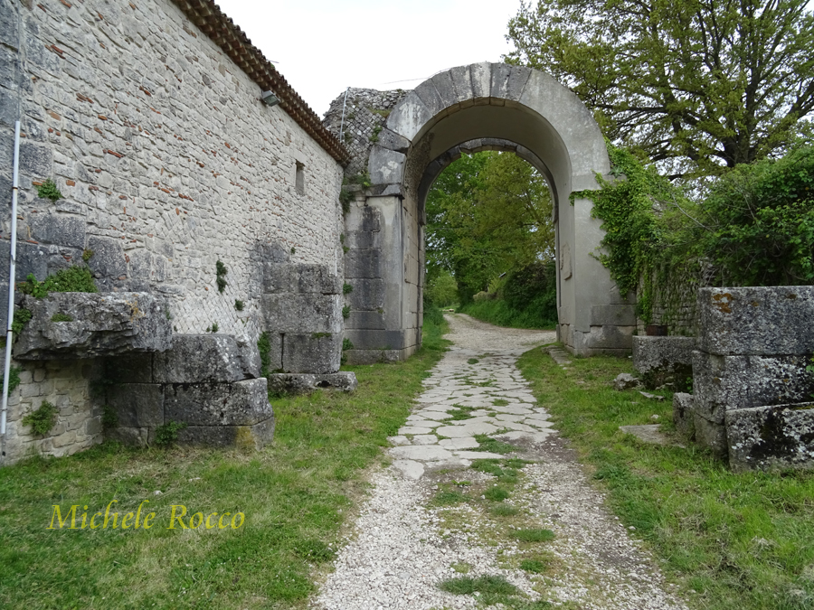Alla città si accedeva attraverso le porte. Al decumano si accede attraverso le due porte. La su menzionata Porta Boiano, di grande imponenza, ricostituita quasi interamente con i reperti dell'epoca. Appena entrati da questa porta si possomo notare dei sistemi di separazione in pietra, che, all'epoca, servivano per contare gli animali che arrivavano in massa, in modo applicare la tassa di passaggio. Tassa su cui, evidentemente, si reggeva l'economia della città. | ||