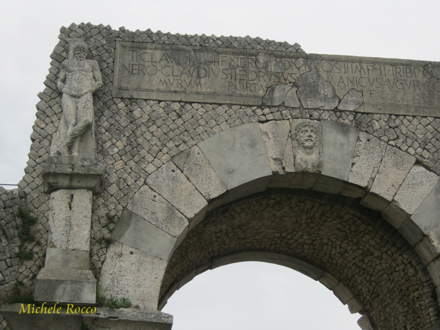 In cima alla porta troviamo un'iscrizione monumentale, mentre ai lati ci sono due figure con le mani legate, forse prigionieri, ma anche ad ammonimento per chi entra in città con scopi non leciti. Al centro della volta è raffiguarata òa testa di quello che potrebbe essere una divinità, forse Ercole. |