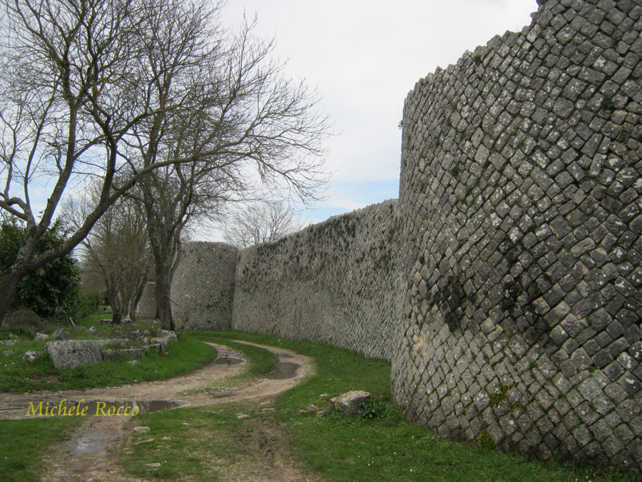 Tutta la città è circondata da mura con torri cilindriche, manufatti realizzati secondo le tecniche romane dell'opus reticulatum. Cunei in pietra dalla base, a vista, in forma quadrata ed allineati obliquamente. |