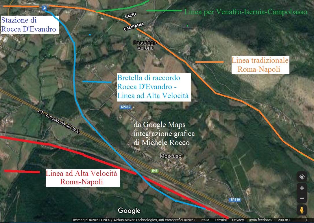 In questo periodo 2021 si sta realizzando l'elettrificazione della linea Campobasso-Roccaravindola. Ebbene si è parlato di accorciamento dei tempi per raggiungere Roma e della possibilità che i nostri treni (a trazione elettrica) possano immettersi sulla linea ad Alta Valocità Napoli-Roma. Si pensa immediatamente che questa immissione possa venire appena usciti dal Molise, ovvero a Rocca D'Evandro, ma in questa stazione e nemmeno in quella di Cassino passa l'alta velocità. In verità da Rocca D'Evandro c'è una bretella che conduce alla linea ad alta velocita ma solo nel verso che conduce a Napoli. Supposto che le condizioni tecniche di velocita dei nostri treni permettano l'immissione nella linea AV, questo avverrebbe solo per Napoli e con l'inversione del senso di marcia! E per Roma? Questa immissione non è possibile. La prima stazione utile sarebbe quella di Sgrugola, ma ci troviamo ad un centinaio di chilometri da Roma. Dopo aver fatto già due ore e mezza di viaggio non credo che un'altra mezzora in alta velocità risolverebbe i nostri problemi. |