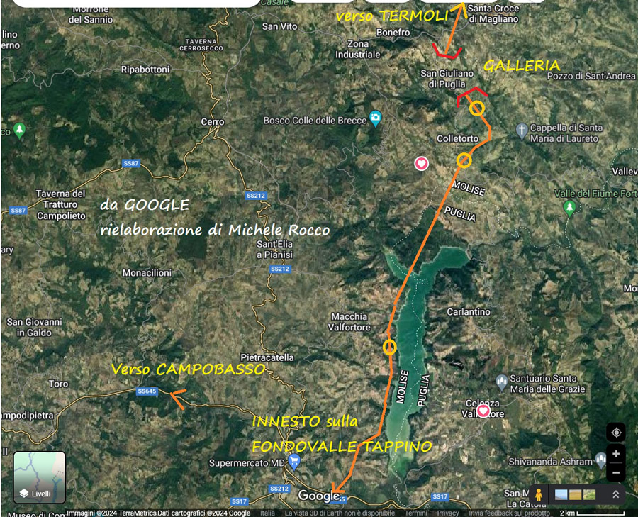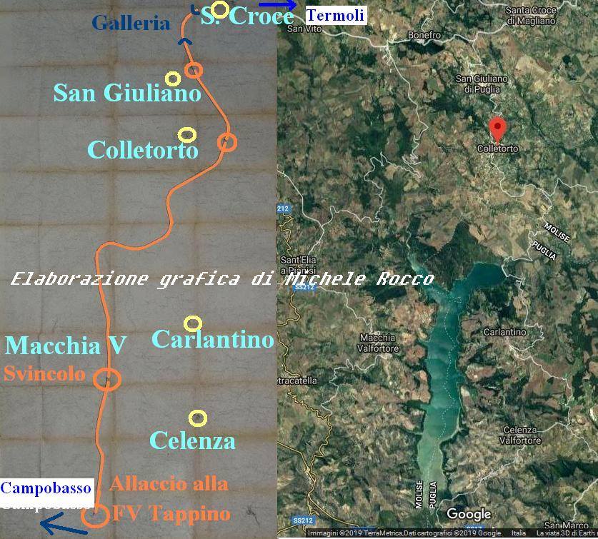 Al tempo, esistendo la Bifernina, nonostante era già emersa qualche problematica in merito ai viadotti sul Lago di Guardialfiera, non si pernsò a dare priorità alla realuzzazione di questo tratto di strada che avrebbe fiancheggiato il Lago di Occhito. Stante la disponibilità di fondi, si preferì realizzare la bretella che da Casacalenda portava sulla Bifernina con innesto al Bivio di Lupara (prima dei viadotti). Così i paesi del medio Fortore, avrebbero potuto raggiungere Campobasso, dalla Bifernina, evitando il valico di Campolieto sulla SS87 d'inverno. Nel contempo, i paesi dell'area di Riccia e il beneventano, con la stessa bretella, portandosi sulla Bifernina potevano arrivare al mare. Gli aggiustamenti intermedi si sarebbero fatti col tempo. E qualcosa nello stesso "verso" è stata fatta. | ||