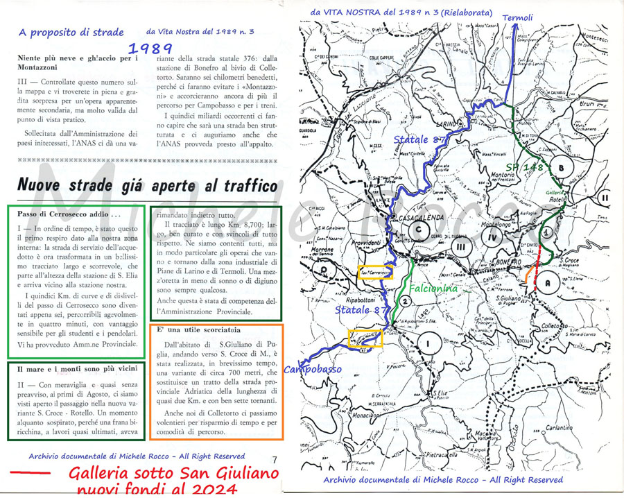 Nell'occasione che si parla di nuovi finanziamanti per strade progettate e mai completate o completate in parte, sono andato a ricercare alcune notizie interessanti su VITA NOSTRA. La rivista porta la data del 1989. Nell'articolo, corredato anche di mappa, si evidenzia come sia già in esercizio le "Falcionina" (oggi variante alla SS 87) che permette di evitare il Valico di Cerrosecco sulla Statale 87 verso Campobasso. Verso Termoli verrà aperta al traffico la strada a scorrimento SP 148 da Santa Croce di Magliano alle Piane di Larino. Un tratto di Variante alla SP 40 sopra San Giuliano permetterà di raggiungere più agevolemnte la SS 376 dei Tre Titoli e quindi la strada a scorrimento SP 148 nominata.