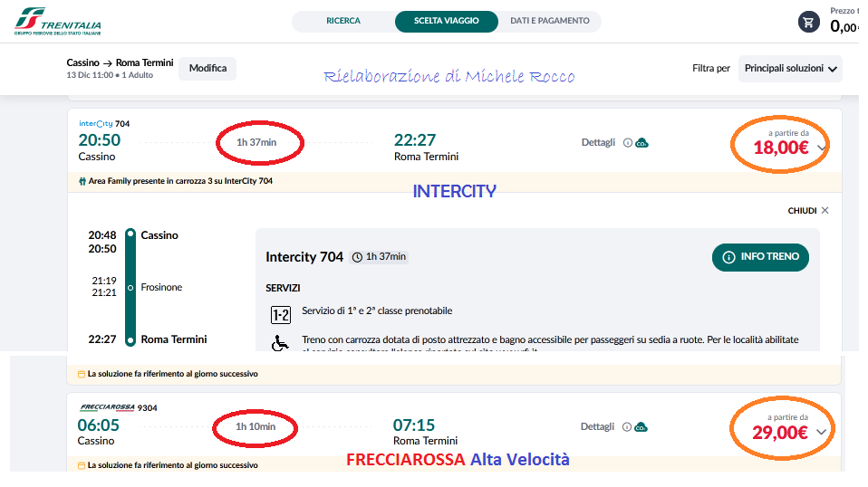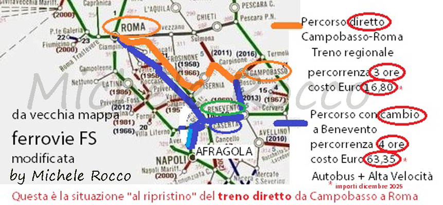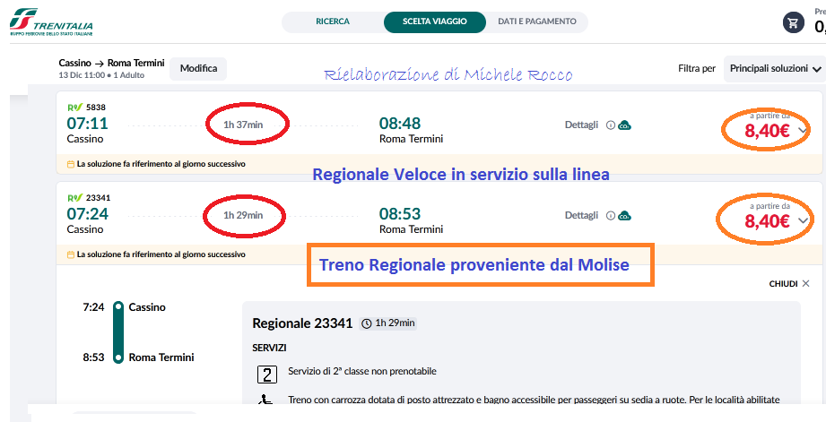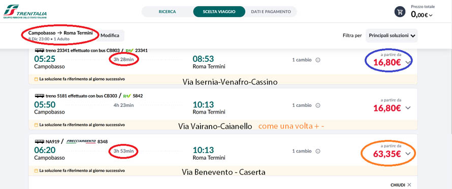Si può notare come il primo treno (5.25 da CB) che da Venafro percorre la galleria e si va ad innestare sulla linea Napoli Roma all'altezza della stazione di Rocca d'Evandro, ha un costo di 16,80 euro. Pari a quello che si ha nel vecchio percorso, molto più lungo, e che prevedeva l'invesione di marcia a Vairano-Caianello. Questo pechè la modifica di tracciato (galleria), con un percorso decisamente più corto, non ha comportato anche una una riduzione del biglietto in termini di chilometraggio. Sono disposizioni che hanno le ferrovie. |