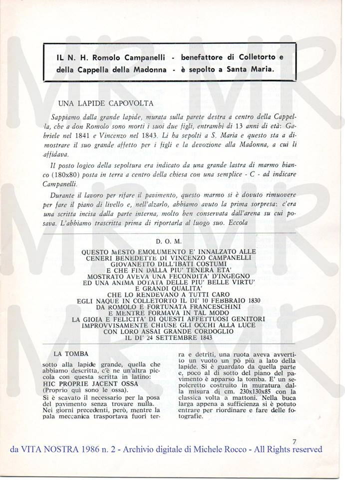 I sacerdoti avevano il privilegio di essere seppelliti davanti alla chiesa, se non dentro, ma anche i "signori" avevano il privilegio di essere seppelliti nel recinto della Cappella di Santa Maria di Loreto. Caso a parte quello di Don Romolo Campanelli i cui figli, morti ancora piccoli, vennero seppelliti all'inteno della Cappella (come recita la lapide sulla parete destra) e egli stesso vi fu seppellito. |