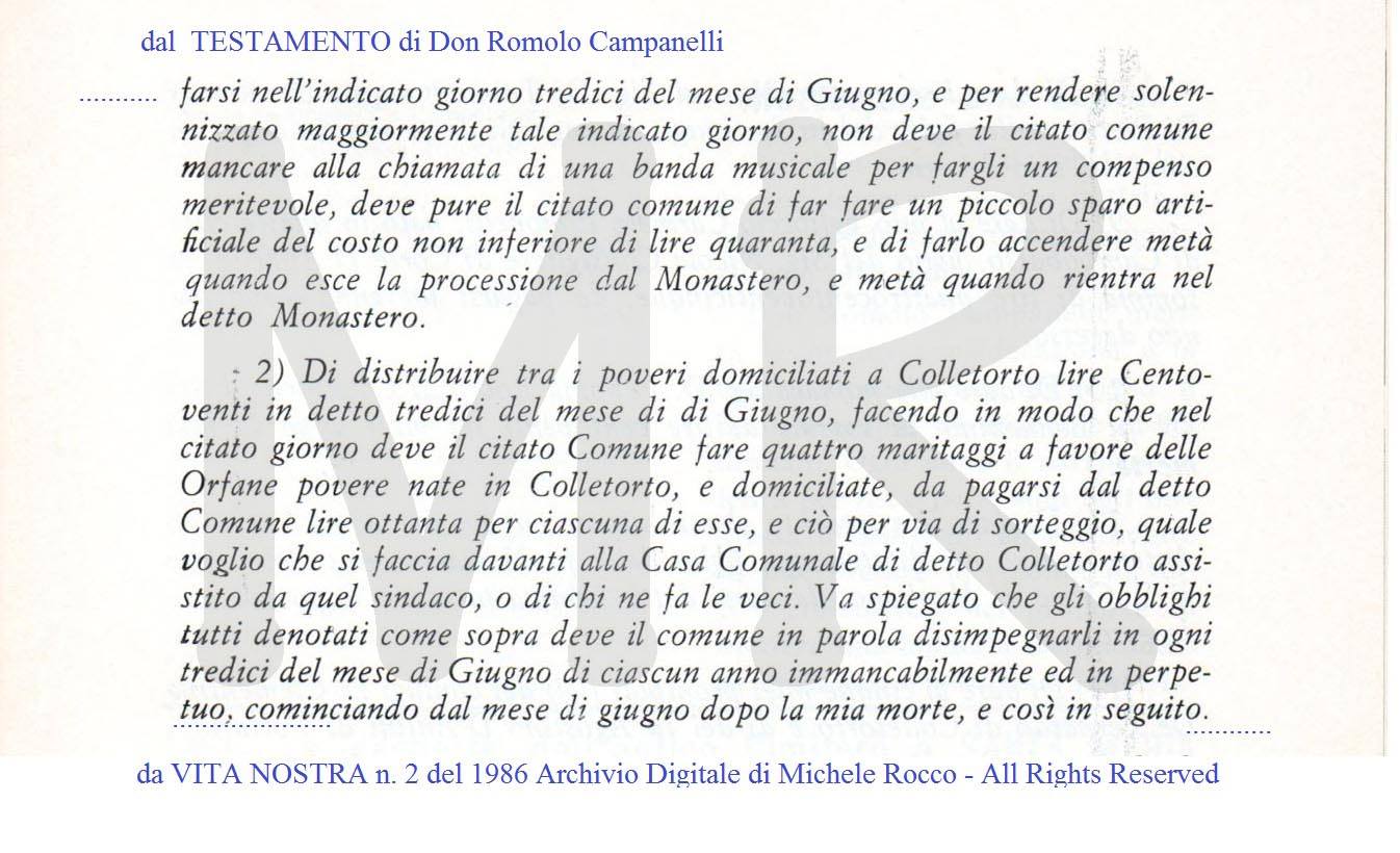 Don Romolo Campanelli (quello dell'omonimo Largo) , Nobil Homo, devoto e gran benefattore, aveva disposto che nel giorno 13 giugno, festa di Sant'Antonio ci fossero i "maritaggi" e che all'uscita e al rientro in chiesa della processione ci fossero gli "spari" e la banda (naturalmente il tutto da prelevare sui suoi lasciti). |