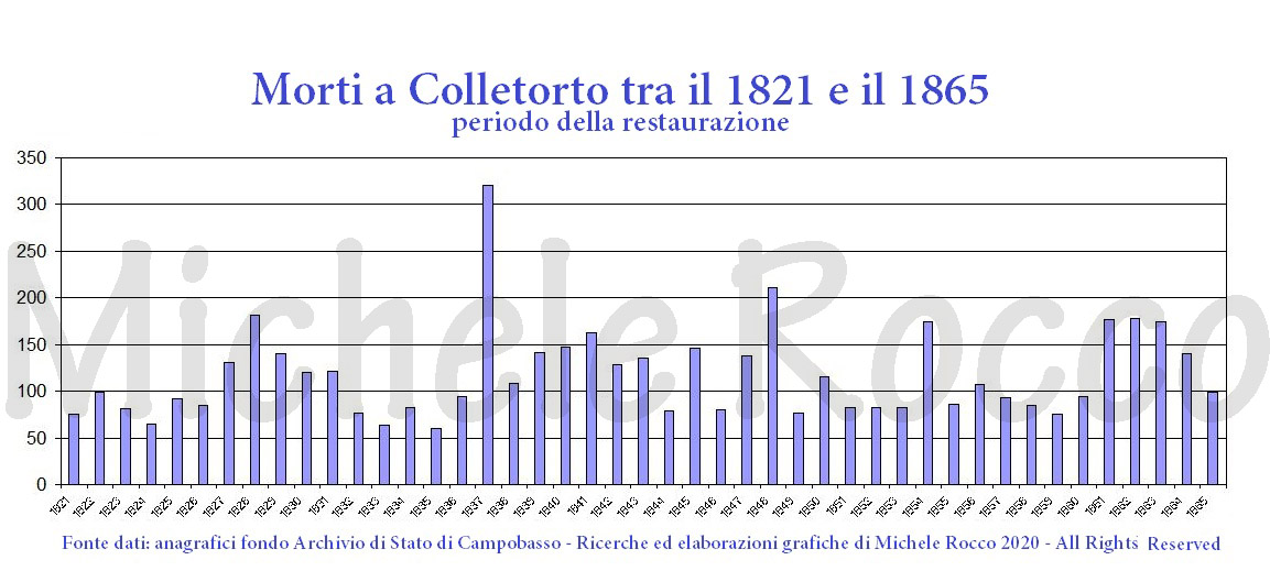 In 45 anni, quasi metà secolo, a Colletorto sono stati registrati più di 5000 morti con una media di poco oltre i 100 morti all'anno. Il 1837 è stato un anno tragico per le morti. A causa di epidemie, su una popolazione di poco più di 3000 abitanti si è arrivati a 300 morti e la maggior parte concentrati nel periodo estivo. Ad Agosto vi sono ben 150 morti, e si tratta generalmente di adulti sposati dai 25 ai 70 anni. In questo mese ci sono mediamente 5 morti al giorno con picchi dal 10 al 17 del mese con punte di 17 morti in una sola giornata e 9 nel giorno del 15 d’agosto.