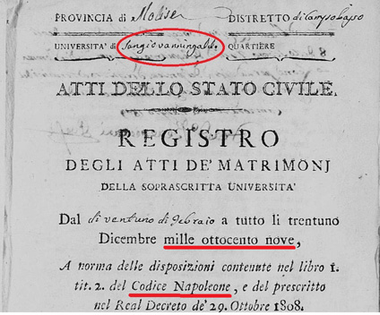 Quelli da me analizzati sono documenti che iniziano ad essere prodotti dal 1809 e sono disponibili (in libera consultazione) per San Giovanni fino al 1910. Il sito che permette di consultarli si chiama Antenati. Il mio lavoro è stato quello di analizzare, con grande fatica circa 1700 matrimoni che sono stati registrati a San Giovanni in Galdo dal 1809 al 1910. |