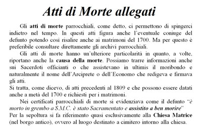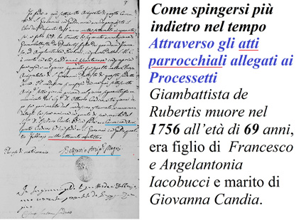 Nell’atto parrocchiale vengono riportati anche i nomi dei Sacerdoti che hanno assistito il moribondo in ultimis. La persona a cui l’atto fa riferimento è Giambattista de Rubertis che ha 69 anni quando muore nell’anno 1756. Questo Giambattista de Rubertis, forse un antenato del Professor De Rubertis qui presente, era certamente un genitore o un avo di uno dei contraenti (sposo o sposa). Abbiamo visto che muore a 69 anni nel 1756. Se fate un po’ i conti, ci troviamo già nel 1600. Ma c’è di più perché sappiamo che era figlio di Francesco e Angelantonia Iacobucci. In questo modo siamo andati indietro anche fino alla metà del 1600. Nell’attestato sappiamo anche il nome della moglie di Giambattista, Giovanna Candia. Perchè c'e questo documento della Chiesa? |
