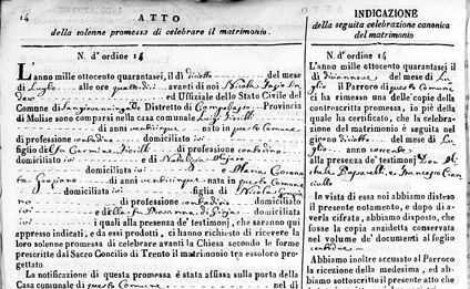 Nel libro, all’inizio di ogni anno, ho riportato il nome del sindaco. Il sindaco poteva anche delegare altra persona che in genere era il Segretario Comunale, ma anche Assessori facenti funzione. Subito dopo viene riportato il nome dello sposo, l’età e la professione, nel caso specifico Luigi Fiorilli di 25 anni contadino. Viene riportata anche la paternità e la maternità. In questi atti di matrimonio non è presente il luogo di abitazione, che ho ricavato analizzando anche gli atti anagrafici dei nati e dei morti nello stesso periodo. Nel prestampato dell’atto di promessa, di lato, vi è la sezione riservata alla chiesa. Il Parroco davanti ai testimoni, Don Michele Passarelli scc.., consacra il matrimonio e rinvia il documento al Comune, accertandone l’avvenuta unione. |