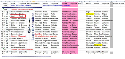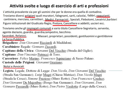 Nel libro ho cercato di salvaguardare la riservatezza, evitando di scrivere, a volte, i cognomi pur trattondosi di cose avvenutu oltre 200 anni. Lo esigono anche le regole deontologiche del sito dove sono pubblicati gli atti. Nei miei database (fogli elettronici) sono integralmente riportati cognomi e notizie. Chi ha interesse o curiosità può andarsi a ricercare gli atti in copia degli originali ed in questa ricerca, come nella ricerca dei propri antenati, possono fare affidamento sulla mia collaborazione on-line. . |