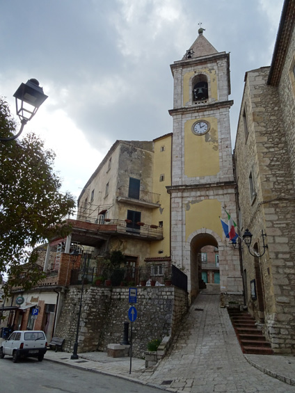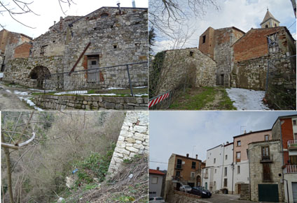 Ad immettere nel borgo, dal lato superiore è l'arco sottostante il campanile. Qui, prima di entrare, possiamo osservare la mura di un'imponente costruzione, la Casa Abaziale. Questa sorge direttamente sul costone roccioso ed anche in questo caso, la sovrapposizione di altre costruzioni non ci permette di capire se vi fossero dei contrafforti. Su questo lato, non essendo la zona particolarmente scoscesa, è possibile che la difesa era rappresentata proprio dal costone stesso. |