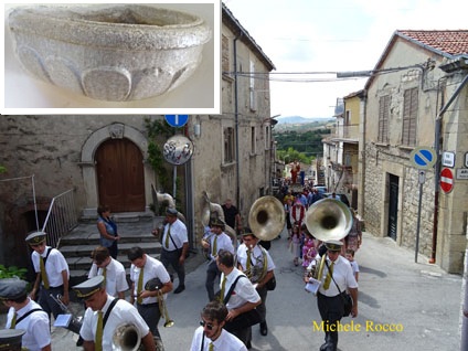 E proprio su Colle Rimontato sorge il Tempio Italico del II secolo a. C., ad evidenza che questo territorio era già abitato al tempo dei Sanniti. Una bella rappresentazione è quella che figura nel quadro del Professore De Rubersis, qui presente, in cui si venodo queste anime che si portano al tempio per omaggiare la dea Cerere per avere buoni raccolti. |