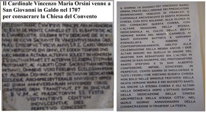 Suppongo che l’Orsini, quando veniva a San Giovanni, dimorasse proprio nella Casa Abaziale che affaccia su questa piazza. Il Cardinale Vincenzo Maria Orsini è venuto a San Giovanni nel 1707, come recita la lapide posta all’interno della Chiesa del Convento per consacrare la stessa chiesa e gli altari. |