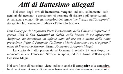 L’Arciprete era quello che redigeva l’atto ma il battesimo lo faceva un Sacerdote (nel caso specifico Don Giuseppe de Majoribus, Prete Partecipante di questa Chiesa Arcipretale della Città di San Giovanni in Galdo) da lui autorizzato. Quello che vi volevo far notare è che questo atto che viene allegato al “processetto” di matrimonio viene redatto in copia 25 anni dopo. Nel caso specifico chi redige l’atto al momento del battesimo è l’Arciprete Francesco Magri, chi ne fa la copia per mandarla al Comune , nel momento in cui, 25 anni dopo, il battezzato si sposa, è l’Arciprete Belisario Magri. |