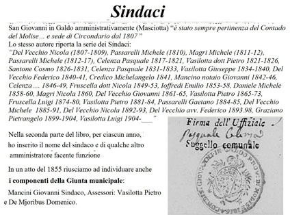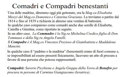 Una curiosità riguarda i i compadri e le comadri,avvero i padrini. La maggior parte dei neonati veniva battezzato dalle persone comuni, ma (forse per ingraziarseli ci si rivolgeva a benestanti) e molto richiesta era questa signora la Mag.ca Elisabetta Miozzi (del Mag.co Domenico e Caterina Graziano) e alcune altre volte le sue sorelle. Vengono appellati come Magnigici. In qualche caso troviamo tra compadri e comadri anche persone di paesi distanti come un Saverio Picchione con relativa consorte di Bonefro, che, evidentemente, stante la distanza, fa procura all’Arciprete affinche sia rappresentato dalla Levatrice (di San Giovanni) Carmina Graziano. |
