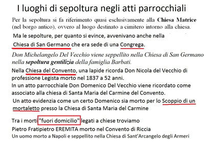 E c’è anche qualcosa di collegato al Convento, non ho trovato proprio il riferimento a sepolture ma una lapide posta in fondo ricorda Don Nicola del Vecchio, di professione Legista, che muore nel 1837 a a 52 anni. In un atto parrocchiale si ritrova anche un Don Domenico del Vecchio, associato alla Chiesa del Convento. Chiesa che risultava di proprietà comunale, come ancora tutt’oggi lo è.