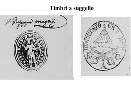 Questo che vi mostro, anche se fatto dal Notaio Vena di Ielsi, è proprio il testo di un atto notarile di consenso. Il Notatio esigeva il suo onorario e le tasse di registrazione. C’era il Bollo con 12 grana e alla fine vi era la distinta di tutti i costi e il suggello, ovvero il timbro che lui definisce segno del mio tabellionato. Il timbro mostrato in basso è quello del Notaio Giovanni Mancini di San Giovanni Giovanni. Il timbro credo che sia proprio quello posto nell'atto di consenso dei genitori di Colletorto per la loro figlia che andava in sposa ad un sangiovannaro. |