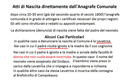 Nel caso di padre ignoto, la madre la si conosceva ed il bimbo prendeva il suo cognome. In realtà più grandi c'era anche il fenomeno degli abbandoni di questi neonati, vicino agli usci delle porte delle ultime case del paese. La mattina i proprietari si trovavano il neonato piangente e lo portavano dal Sindaco che, dopo i sommari rilievi, gli dava il nome e ne faceva l'affido. Penso che proprio per evitare questa pratica dell’abbandono, a livello centrale, fu consentito alla donna che aveva partorito di non essere nominata nell’atto di nascita. In questi casi i Sindaci mettevano al neonato nomi e cognomi di fantasia. Lo affidava alla levatrice che se ne occupava in prprio o lo conduceva al Befrotrofio di Campobasso. A volte, la mamma a distanza di tempo ne facevam il riconoscimento. |