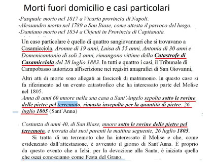 Un caso particolare è quello di queste quattro persone che sono morte a nella Catastrofe di Casamicciola del 1883, cioè un terremoto e queste persone sono morte sotto la macerie ed erano di San Giovanni. Cosa ci facessero a Casamicciola non lo so. Ricordo però che il mio bisnonno materno, nonostante non fosse un benestante, ma riusciva guadagnare qualcosa con la vendita dei prodotti del suo orto, ogni anni si reacava con la moglie alle Terme di Casamicciola per 15 giorni. Parlo dei casi particolari perché questi richiamano di più l’attenzione. In un altro caso una donna muore sepolta dalle rovine conseguenti al Terremoto del 26 luglio 1805, è un fatto avvenuto in un altro paese, ma si cita questo terremoto che è lo stesso a cui fa riferimento la Festa del Grano di Jelsi. |