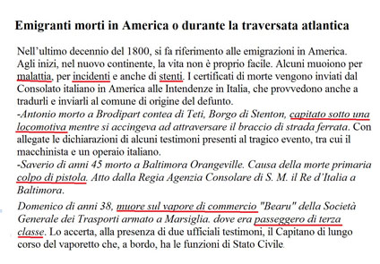 Riporto il caso di Antonio che muore nel Borgo di Stenton in America, capitato sotto una locomotiva e di questo evento ci sono due testimoni, il macchinista e un operaio italiano. Un caso non citato è quello di Saverio che muore per un colpo di pistola. Poi c’erano quelli che morivano in viaggio. Ce ne sono almeno due o tre che ho trovato. Uno di essi riguarsa un uomo che muore sul vapore di Commercio Bearu di una Società di trasporti armato a Marsiglia. Il Capitano della nave redige l’atto ed appena è possibile consegnarlo a terra, viene inviato al Consolato. Il cadavere credo venisse buttato in mare. Questi documenti erano scritti nella lingua della nazione in cui era avvenuto il decesso e il consolato italiano provvedeva a farli tradurre. |