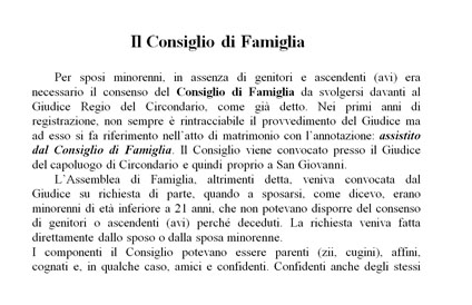Nel frontespizio del libro ho voluto inserire uno schema molto semplificato di albero genealogico proprio per dare un’immediata idea del contenuto del libro. Nello stesso frontespizio ho messo in evidenza alcune aree tematiche trattate come il Consenso con Atto Notarile, l’Autorizzazione di Sua Maestà, il Consiglio di Famiglia, gli allegati degli Archivi Parrocchiali. Tutte cose di cui parlerò in seguito. |