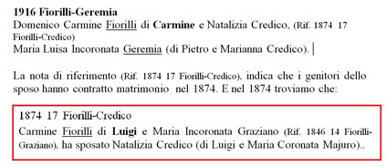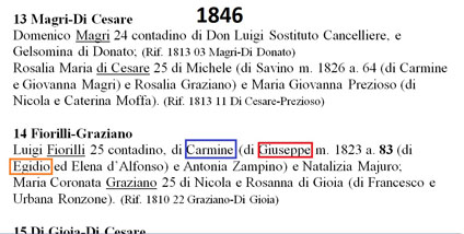 Vado a ricercare nel libro l’anno 1874 e il matrimonio 17 Fiorilli-Credico. Nel 1874, trovo che Carnine (padre di Domenico) è figlio di Luigi e Maria Incoronata Graziano. E qui c'è il successivo riferimento (Rif. 1846 14 Fiorill- Graziano). Vado a ricercare nel libro l’anno 1846 e trovo il matrimonio 14 Fiorilli-Graziano, a cui ho fatto riferimento all'inizio. |