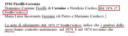 I nostri antenati più prossimi (nonni e bisnonni) di cui sicuramente conosciamo i nomi, possono essere individuati nell'ultima sezione del libro (matrimoni di fine 1800 inizio 1900). Nell’esempio faccio riferimento ad un matrimonio del 1916 in cui Domenico Fiorilli sposa Maria Luisa Geremia. I Genitori di Domenico sono Carmine e Natalizia Credico. E qui, come vedete ho messo una nota di riferimento (Rif. 1874 17 Fiorilli-Credico). Questo significa che i genitori di Domenico si sono sposati nel 1874. |
