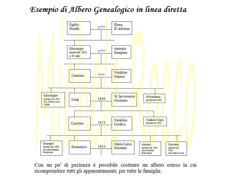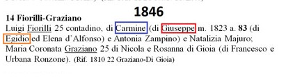 Faccio riferimento all'atto di promessa di matrimonio di Luigi Fiorilli, riportato all'inizio (qui trascritto nella pagina del libro). Il matrimonio è del 1846, riesco ad individuare il padre Carmine che a sua volta era figlio di Giuseppe, ma queste sono già delle integrazioni che ho fatto. Giuseppe è morto nel 1823 a 83 anni, ci troviamo nella prima metà del 1700 e, considerando che sono riportati anche i suoi genitori, possiamo dedurre che il padre Egidio sia vissuto all’inizio del 1700. Come collegare questo matrimonio di oltre un secolo e mezzo fa ai nostri antenati più prossimi? |